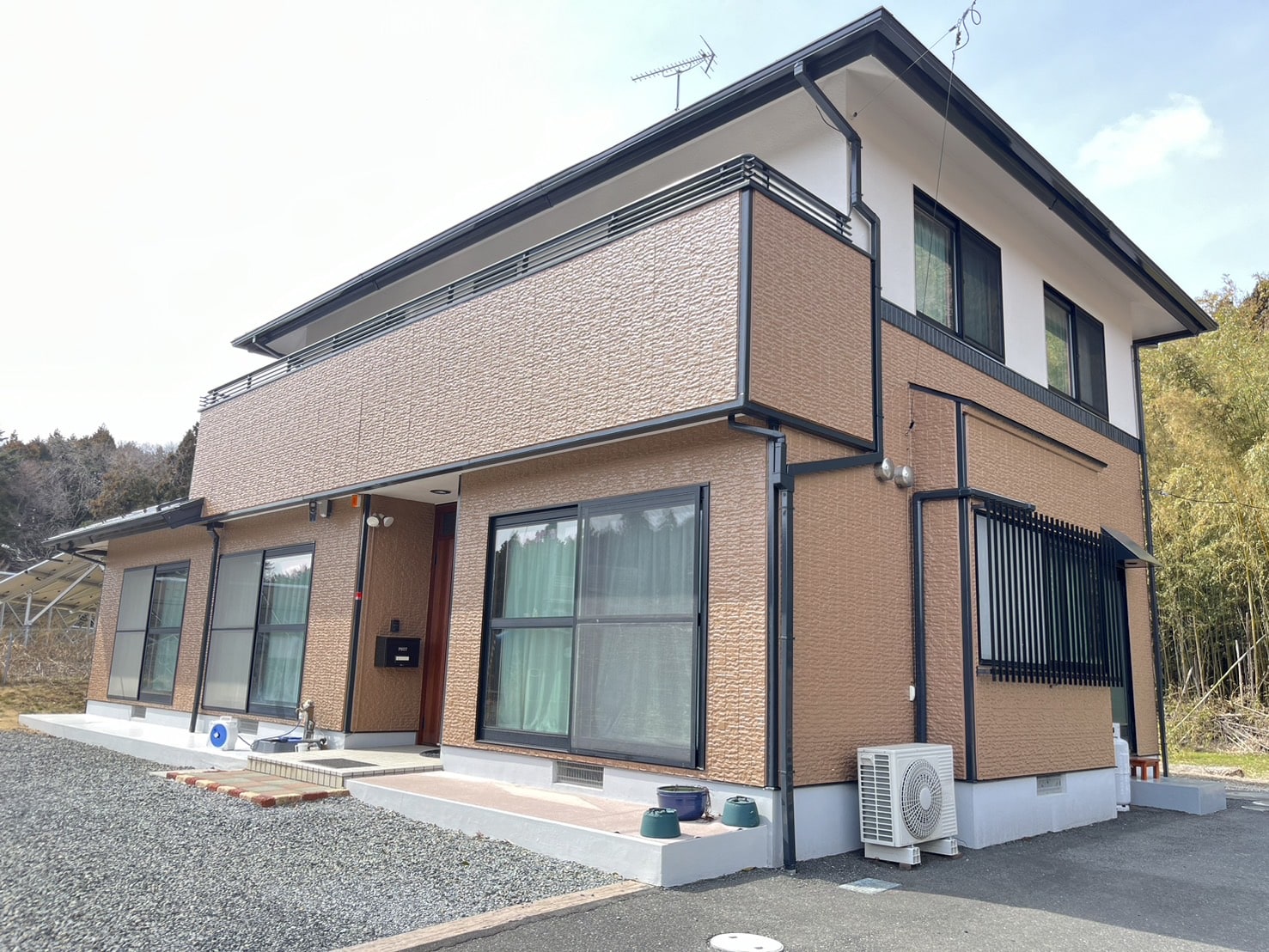施主様のご要望により、周囲の自然景観に馴染む落ち着いた色合いで仕上げました。休日のくつろぎ空間にふさわしい、上品で温かみのある外観を実現しています。